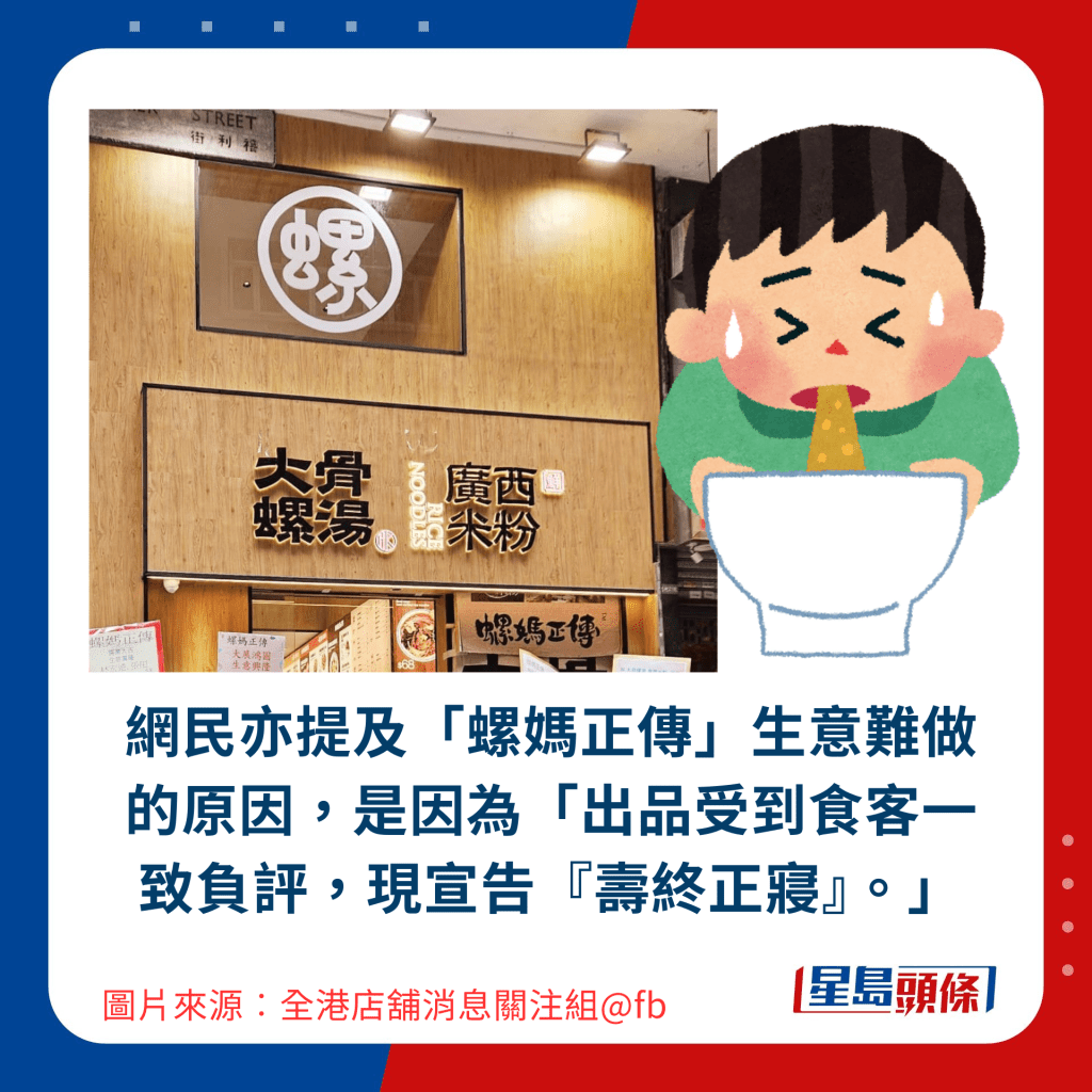 ▲網(wǎng)民亦提及“螺媽正傳”生意難做的原因,是因?yàn)椤俺銎肥艿绞晨鸵恢仑?fù)評(píng),現(xiàn)宣告‘壽終正寢’?!?/strong>