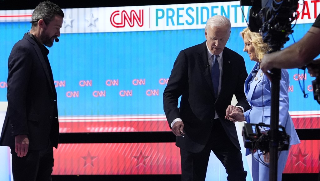 拜登在完成辯論后,被妻子小心扶下只有一級樓梯的講臺。 美媒認為,此顯示他身體不太受控制。 美聯(lián)社