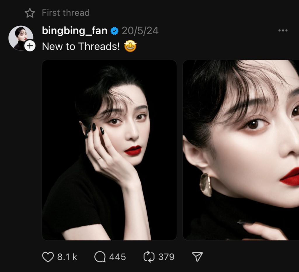 ▲努進(jìn)軍海外市場(chǎng)的范冰冰,最近更驚喜加入Threads,首篇貼文分享了未曾公開的美照。