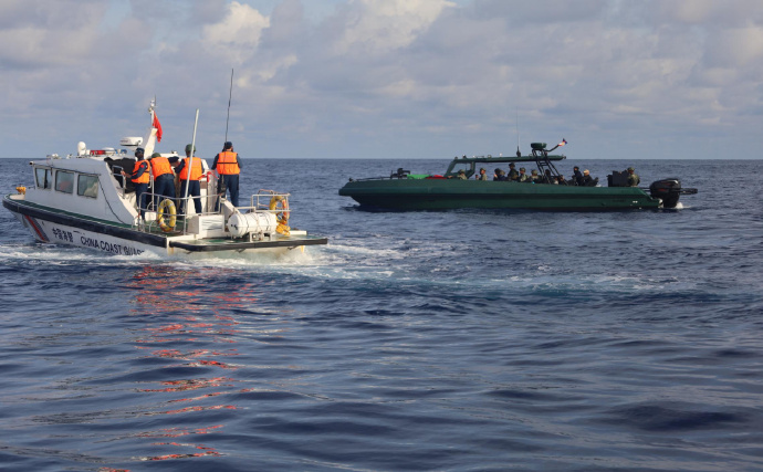 中方公布,中國海警(白色)快艇截停菲軍快艇。