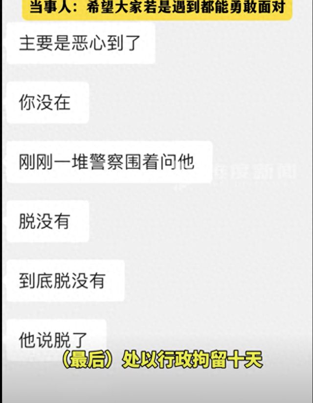 音樂節(jié)安保人員事后與受害女子,將男子移交給現(xiàn)場(chǎng)的民警。女子指,當(dāng)錄口供時(shí),朋友發(fā)來消息,說男子承認(rèn)脫褲子露出下體,并往她的褲子上蹭。后來,女子接到警方電話通知,涉事男子被處以10日行政拘留的處罰。