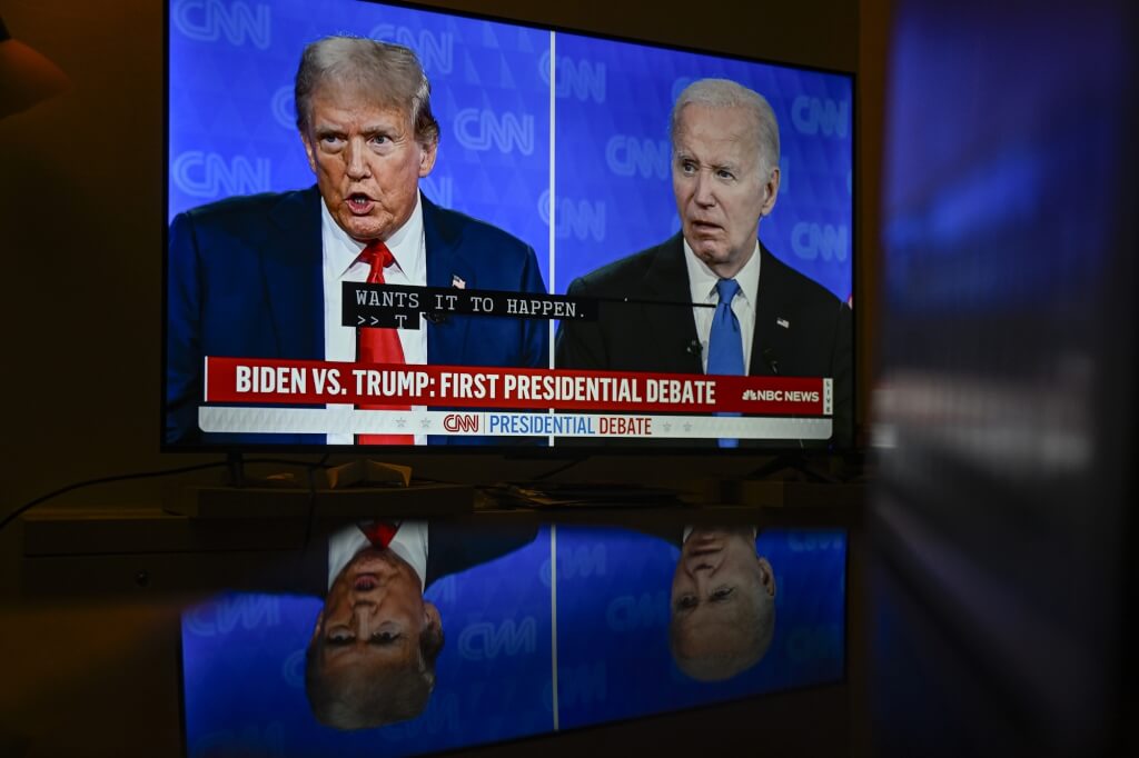 ▲6月27日美國維吉尼亞州一處電視播放拜登(右)和特朗普(左)的首次辯論。(安納杜魯新聞社)