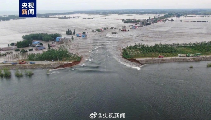 ▲洞庭湖決堤,洪水淹沒堤防外土地和村莊。微博@央視新聞