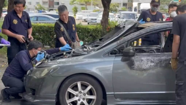 ▲林士杰8日清晨在住處門口遭槍擊送醫(yī)不治,警方案發(fā)后在南區(qū)一處停車場找到疑似用來接應(yīng)槍手用的自小客車,車輛疑遭縱火滅證,鑒識人員到場進(jìn)行采證。中央社