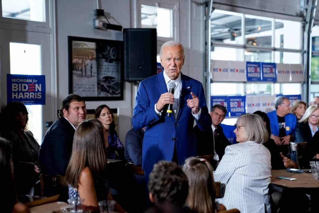 ▲美國(guó)總統(tǒng)拜登(中)12日在密歇根州一家餐廳內(nèi)對(duì)支持者發(fā)表談話。(路透社)