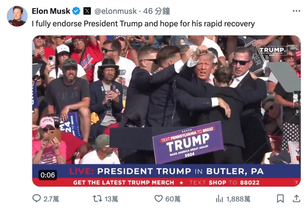 ▲槍擊后,馬斯克表態(tài)支持特朗普競(jìng)逐總統(tǒng)。
