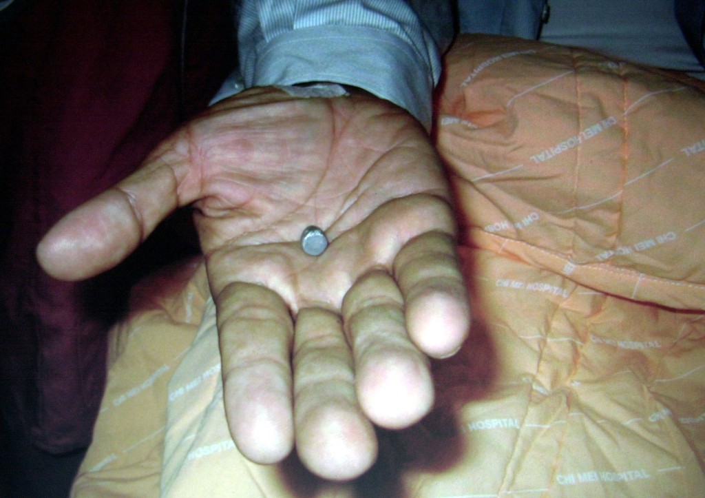 ▲奇美醫(yī)院發(fā)布照片﹐展示陳水扁身體和衣服之間發(fā)現(xiàn)的彈頭。 美聯(lián)社