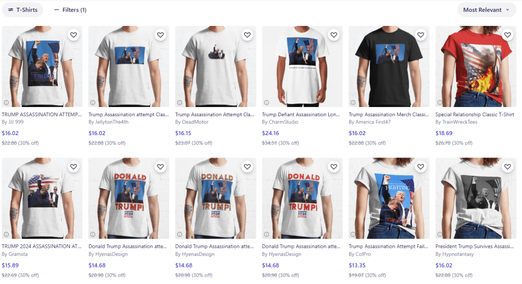 早前特朗普在競選活動(dòng)集會(huì)上遇刺,槍手開槍造成一死兩傷。特朗普在事件中右耳受傷,離場前緊握拳頭向群眾致意。特朗普在治療傷勢后,稱自己不會(huì)投降。在不足一天內(nèi),美國有民眾把特朗普在事件中的形象造成T恤出售。