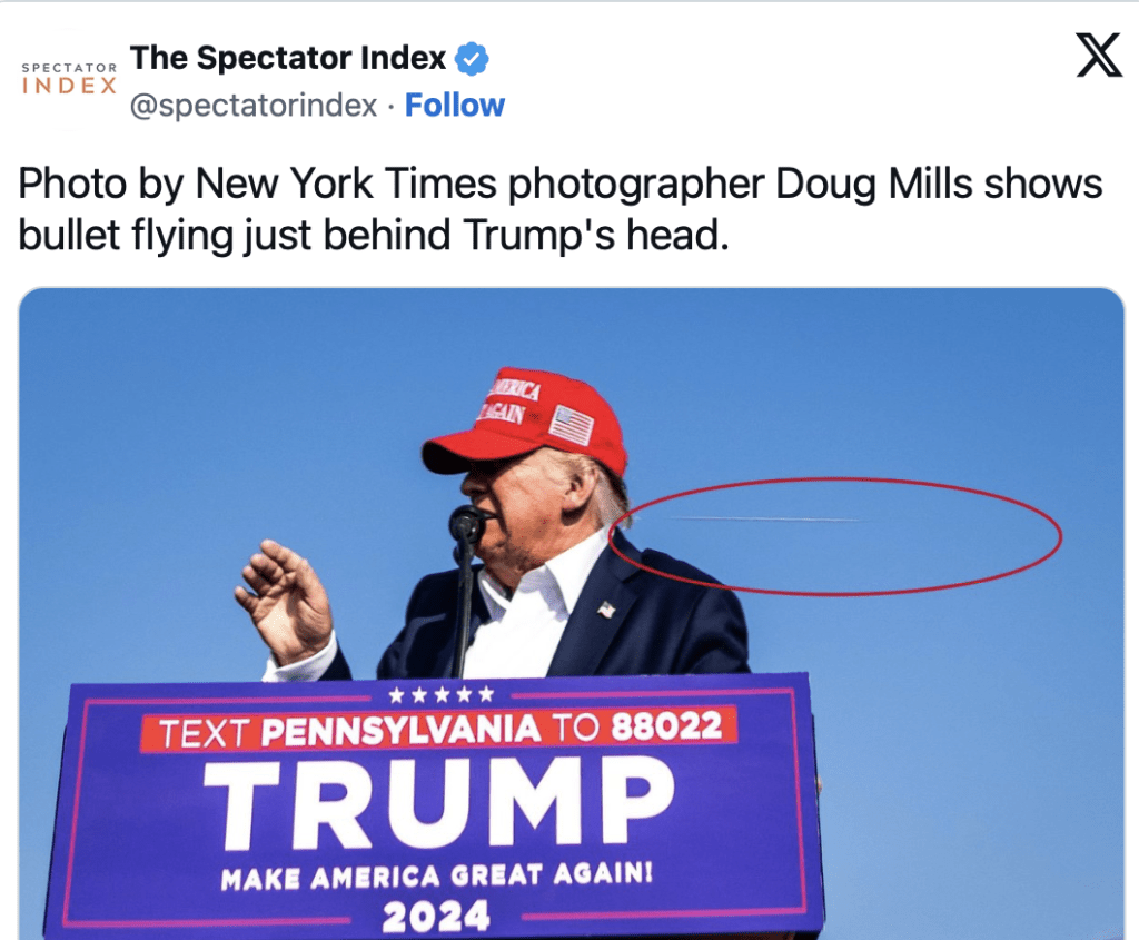 《紐約時(shí)報(bào)》(The New York Times)資深攝影記者米爾斯(Doug Mills)疑似拍到子彈在特朗普頭部附近呼嘯而過的震撼畫面。社交平臺(tái)X截圖