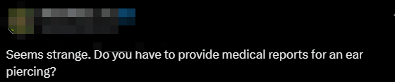還有人說,“看起來很奇怪。耳朵穿孔需要提供醫(yī)療報告嗎?”