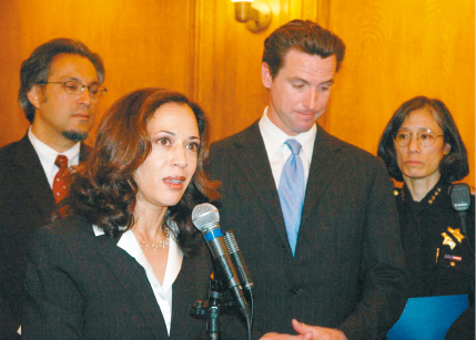 ▲哈里斯2005年時(shí)任舊金山地檢官與時(shí)任舊金山市長(zhǎng)紐森等出席記者會(huì)。本報(bào)資料圖片