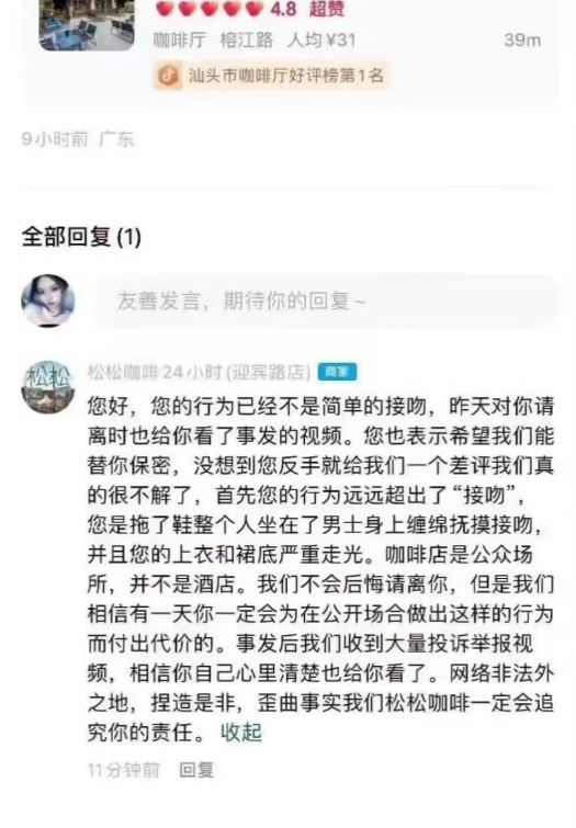 女子騎坐男友激吻互摸8分鐘,汕頭咖啡店驅(qū)離反被差評