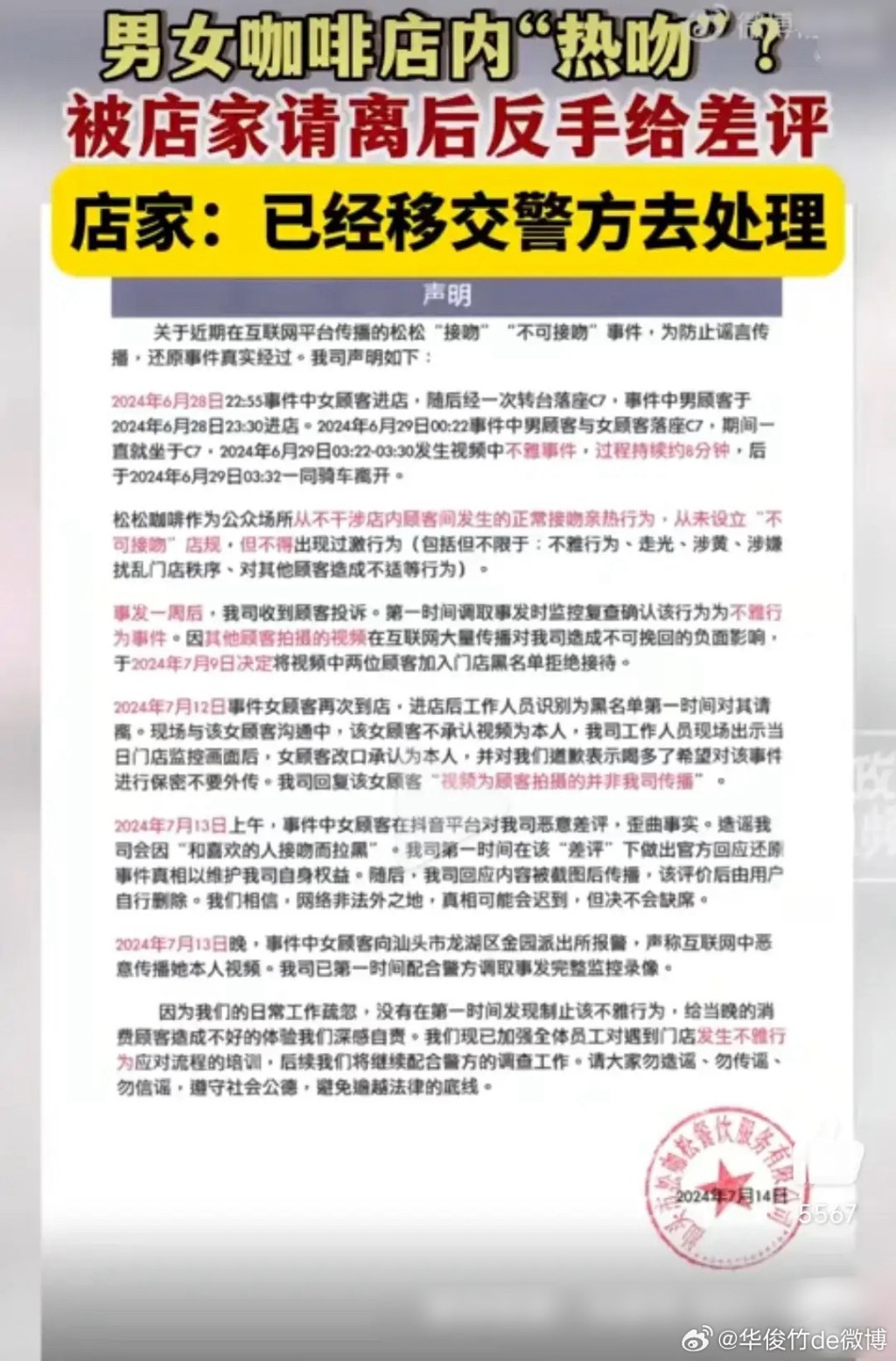 店家表示,咖啡廳是公共場合,并非私人旅館,對于請離顧客并不感到后悔,目前已經(jīng)報警處理,后續(xù)交由警方調(diào)查。