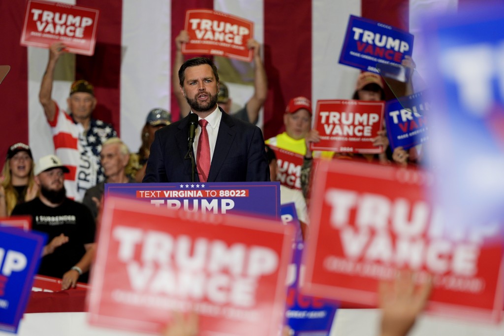 ▲特朗普副手萬斯首次單獨造勢,斥哈里斯比拜登差100萬倍。 美聯(lián)社