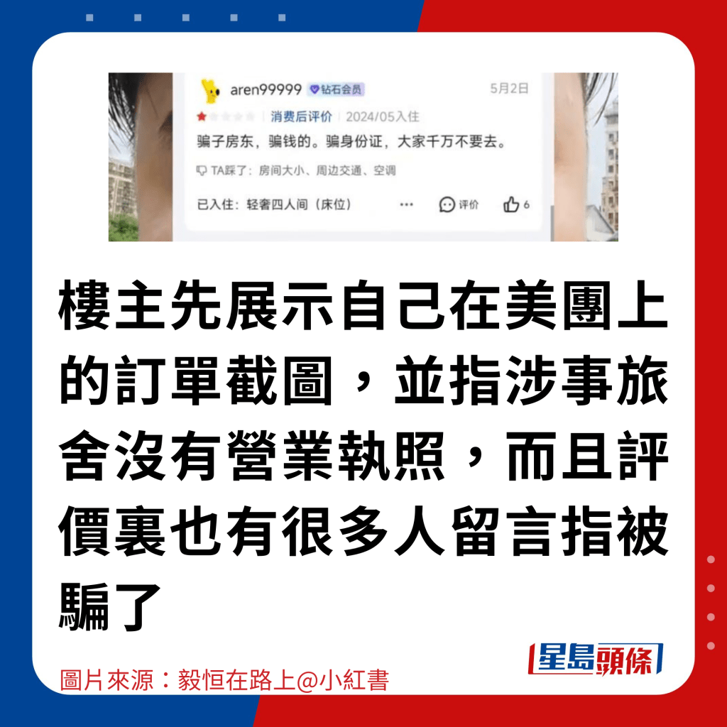近年港人熱衷北上過(guò)夜消費(fèi),與香港相鄰的深圳更是港人的熱門旅游地點(diǎn),但是在預(yù)約酒店時(shí)要多加注意,小心被騙!近日,有內(nèi)地男在小紅書發(fā)文,指自己在美團(tuán)預(yù)約旅舍,但卻在入住前就被濫收服務(wù)費(fèi)及手續(xù)費(fèi)。內(nèi)地男不忿,續(xù)報(bào)警求助,后來(lái)更發(fā)現(xiàn)原來(lái)該旅舍“根本不存在”!