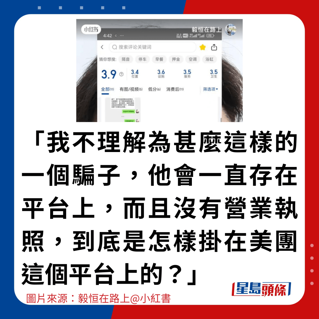 「我不理解為什么這樣的一個(gè)騙子,他會(huì)一直存在平臺(tái)上,而且沒(méi)有營(yíng)業(yè)執(zhí)照,到底是怎樣掛在美團(tuán)這個(gè)平臺(tái)上的?」