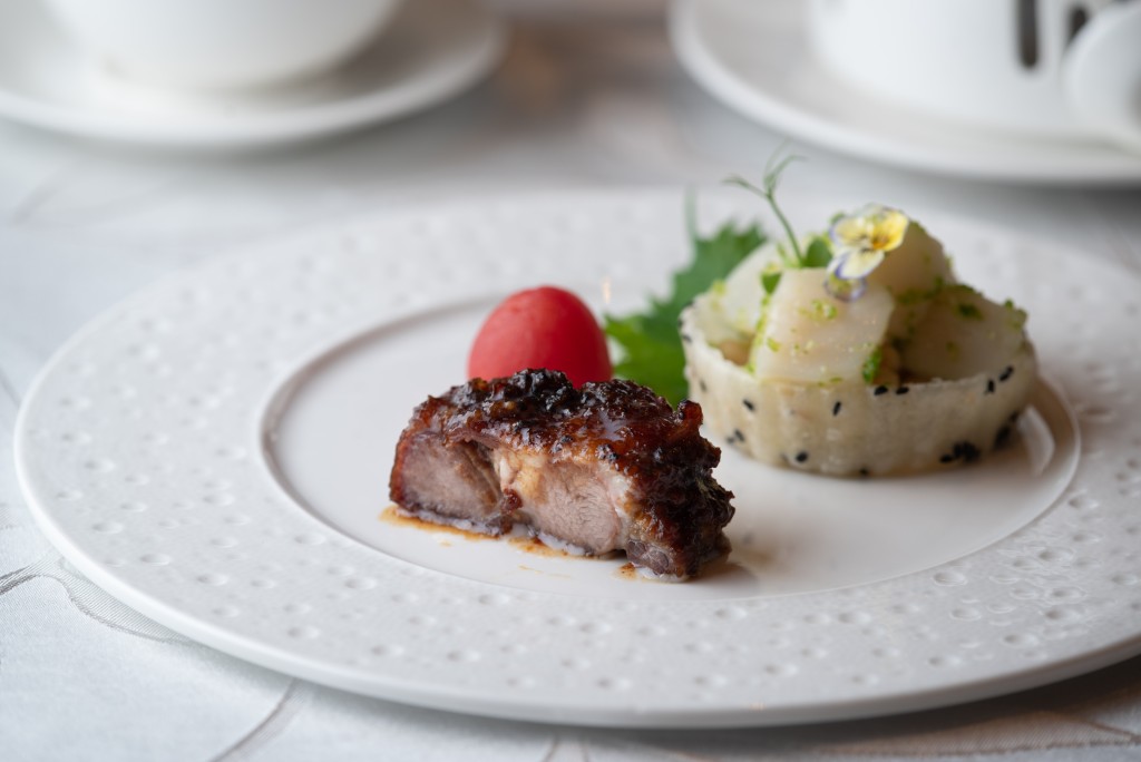 新創(chuàng)作的中式前菜十分講究,是把惹味的椒麻澳洲帶子鮮核桃,伴以焦糖伊比利亞黑毛豬叉燒上桌。去皮核桃配帶子肉拌勻,加上少許香辣的醬料,相當(dāng)醒胃。伊比利亞黑毛豬叉燒有三分肥七分瘦,外層焦香及肉質(zhì)細(xì)嫩,兩者結(jié)合成為一道口感豐富的中菜。主菜之一的火燄鹽焗斗門奄仔蟹,奉客前才澆茅臺(tái)點(diǎn)火,滿足視覺效果。
