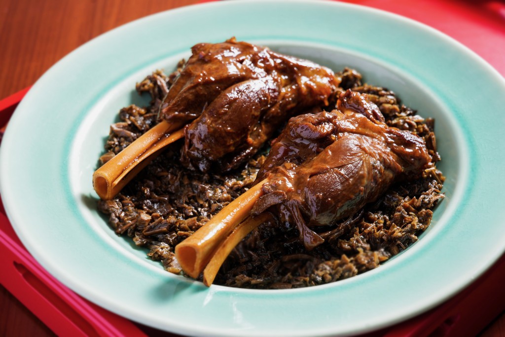 九層塔黑牛肝菌糯米燜南瓜是昔日農(nóng)家菜的改良版,何師傅除采用泰國(guó)糯米、日本南瓜及素菜湯,還加入來自云南的黑牛肝菌,加上九層塔的香味,充滿清新氣息。梅干菜筍干扣羊膝以經(jīng)典中菜梅菜扣肉為創(chuàng)作靈感,改用澳洲羊膝代替五花腩減少油膩,炎夏吃最適合不過。