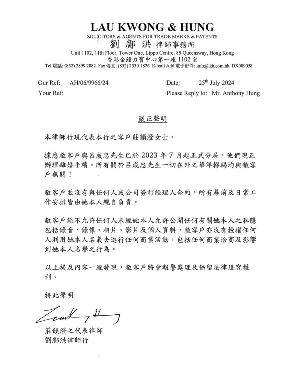 ▲莊韻澄今日(26日)貼出一封律師信,指與呂成忠由7月起正式分居,現(xiàn)正辦理離婚手續(xù)。