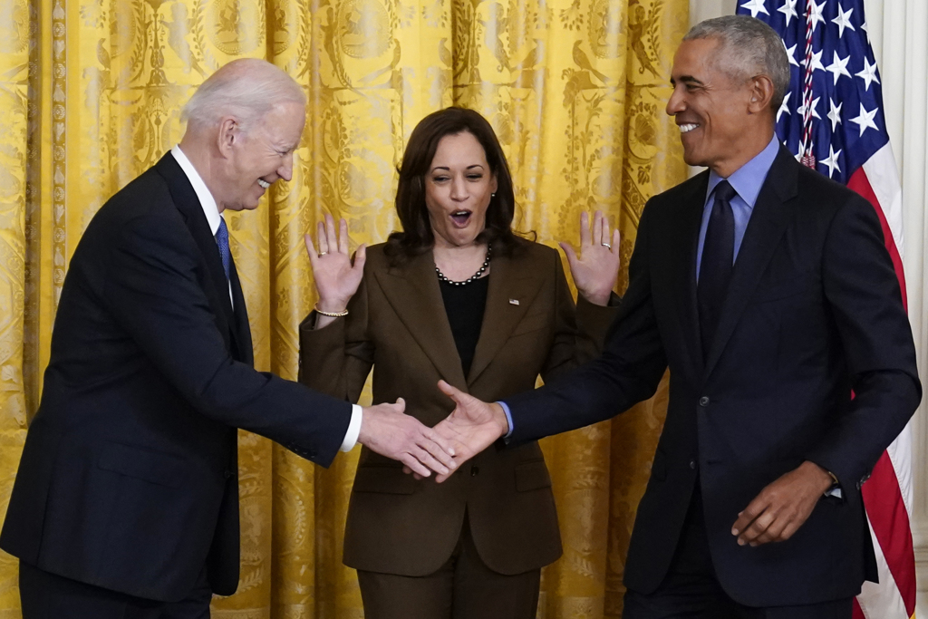 美國前總統(tǒng)奧巴馬(右)2022年4月赴白宮出席活動與總統(tǒng)拜登(左)握手時稱呼拜登為“副總統(tǒng)”,副總統(tǒng)哈里斯(中)露出夸張表情。
