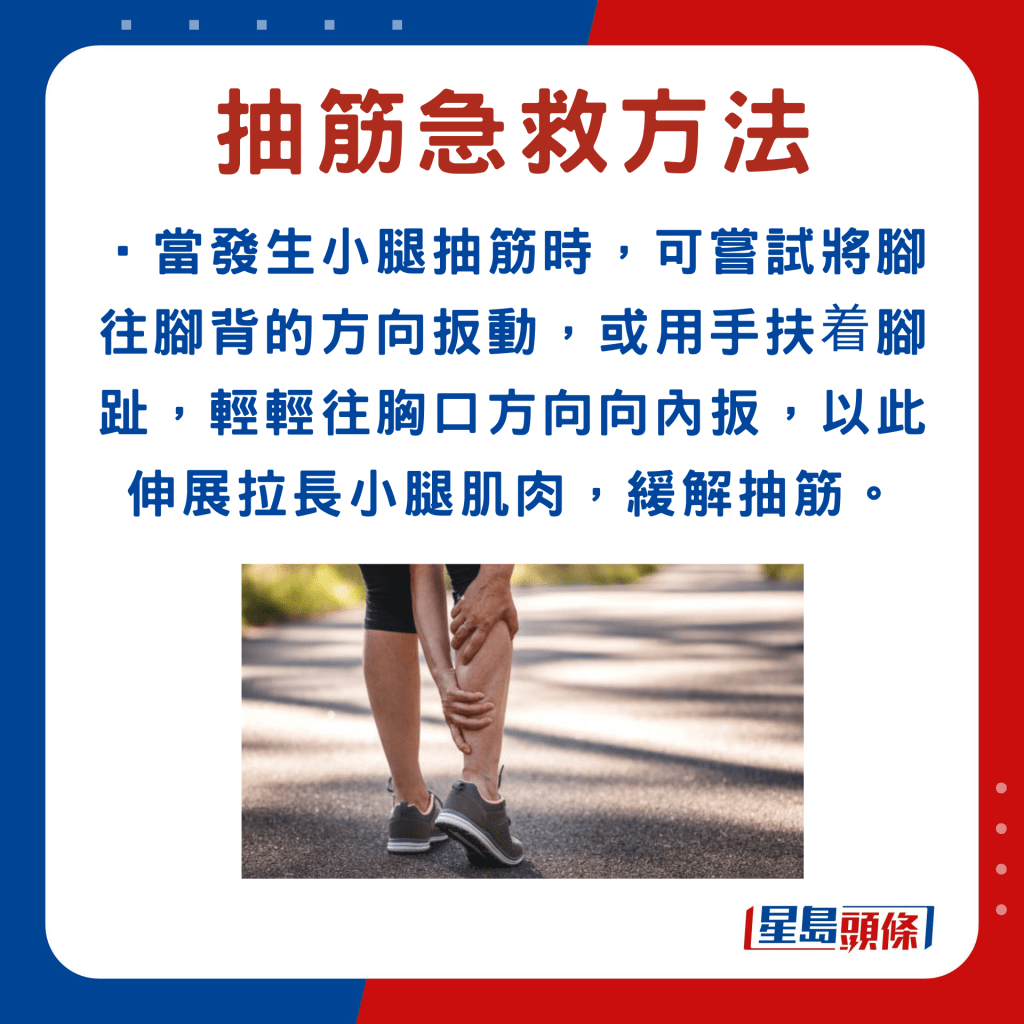 · 紓緩做法:腳往腳背的方向扳動(dòng),或用手扶著腳趾,輕輕往胸口方向向內(nèi)扳,以伸展拉長(zhǎng)小腿肌肉。