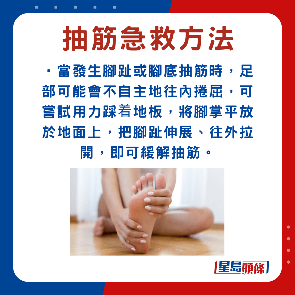 · 例如大腿、臀部、手臂、手指等,先盡量讓抽筋的肌肉休息,并緩慢地往肌肉收縮的反方向拉伸,亦可適量按摩,以放松肌肉。