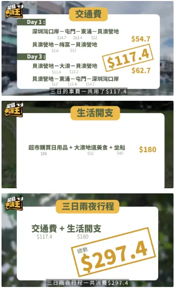 抵達(dá)營(yíng)地的時(shí)候,小蔥帶備帳篷和足夠三天所需的干糧。因此三日兩夜香港之旅的消費(fèi)主要用于交通和生活必需品,共花費(fèi)297.4元。最驚訝的是第二天,小蔥一分錢(qián)都沒(méi)有花,她只徒步來(lái)回貝澳營(yíng)地及望東灣。