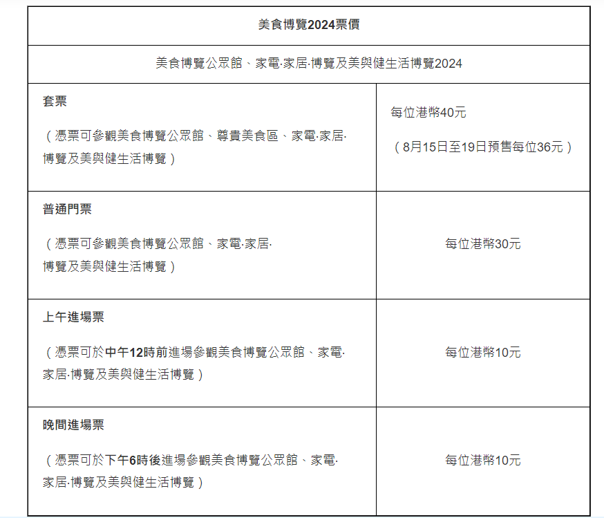 今年美食博覽繼續(xù)設(shè)有不同門票種類,包括適用于不同區(qū)域的套票(包尊貴美食區(qū)),每位$36起(8月1至14日預(yù)售每位$36;8月15至19日每位$40);普通門票每位$30;上午及晚間入場門票優(yōu)惠價$10。