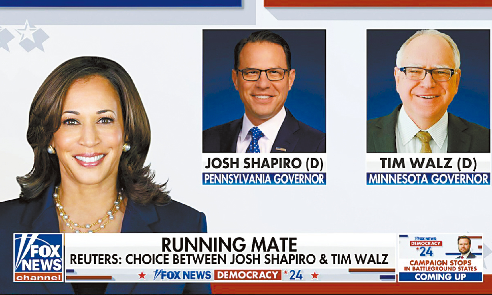 ▲消息指,副總統(tǒng)搭檔人選的最終名單已縮窄至兩人,分別是賓州州長夏皮羅以及明尼蘇達(dá)州州長沃爾茲。電視截圖