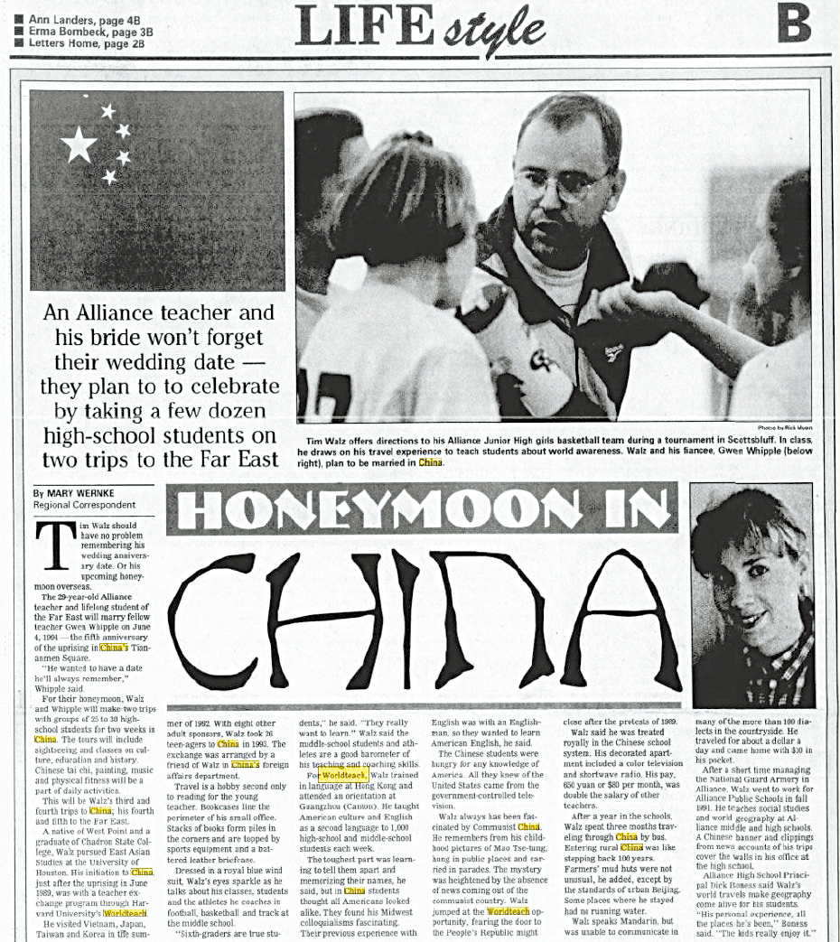民主黨副總統(tǒng)參選人沃爾茲(Tim Walz)與中國關(guān)系密切,早在1989年他便前往廣東佛山教書,因此能說簡單的普通話,后來與妻子度蜜月時(shí)亦選擇中國,歷年來先后赴華30次,并且創(chuàng)辦公司,專門為高中生舉辦中國交流團(tuán)。由于這些背景,共和黨質(zhì)疑沃爾茲親中。