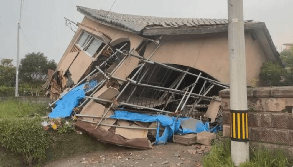 ▲鹿兒島大崎町出現(xiàn)5強(qiáng)以上震度,一幢2層樓高的木造建筑物被震至45度角傾斜倒塌。