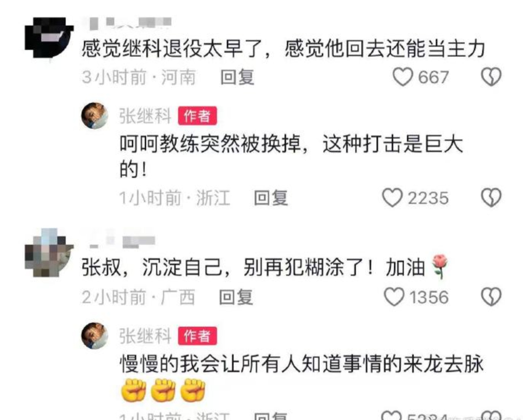 關(guān)鍵字“景甜取關(guān)了張繼科”、“張繼科 我會讓所有人知道來龍去脈”、“張繼科 教練被換打擊巨大”等話題,昨(8日)霸占微博熱搜榜,從流傳的截圖中可見,網(wǎng)友在社群平臺鼓勵留言:“張哥,沉淀自己,別再犯糊涂了!加油”,釣出張繼科回應(yīng):“慢慢的,我會讓所有人知道事情的來龍去脈”,另一位網(wǎng)友則評論道:“感覺繼科退役太早了,感覺他回去還能當(dāng)主力”,張繼科則說:“呵呵,教練突然被換掉,這種打擊是巨大的!”,雖然張繼科的回應(yīng)有些毫無頭緒,相關(guān)實(shí)情內(nèi)幕引發(fā)大批網(wǎng)友好奇。