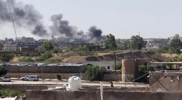 ▲6月7日,也門(mén)首都薩那的一個(gè)胡塞武裝軍營(yíng)在遭到空襲后升起濃煙(手機(jī)照片)。新華社