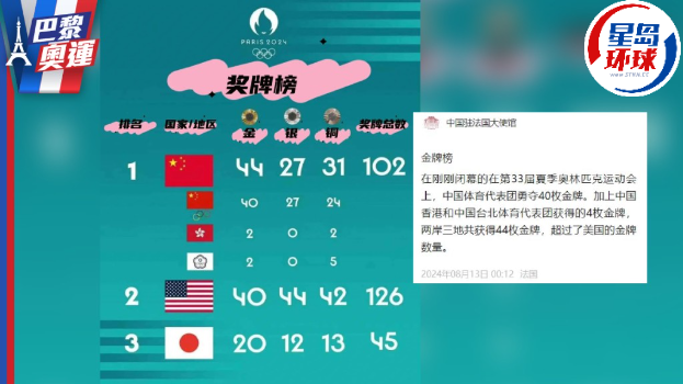 ▲中國駐法大使館:兩岸三地44枚金牌超過美國(微信)