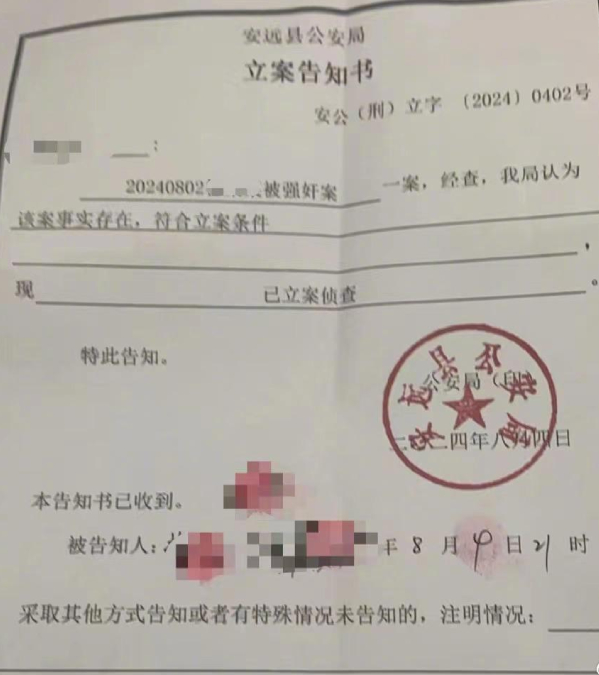而據(jù)公安局8月4日晚9時出具的《立案告知書》顯示,杜某某涉嫌被強奸一案,“經(jīng)查,我局認為該案事實存在,符合立案條件,已立案偵查?!?/p>