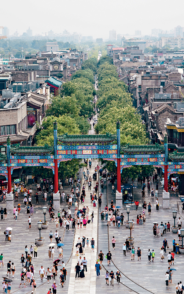 ▲從正陽(yáng)門箭樓往南望,熱鬧的前門大街及遠(yuǎn)處的永定門都一覽無(wú)遺。