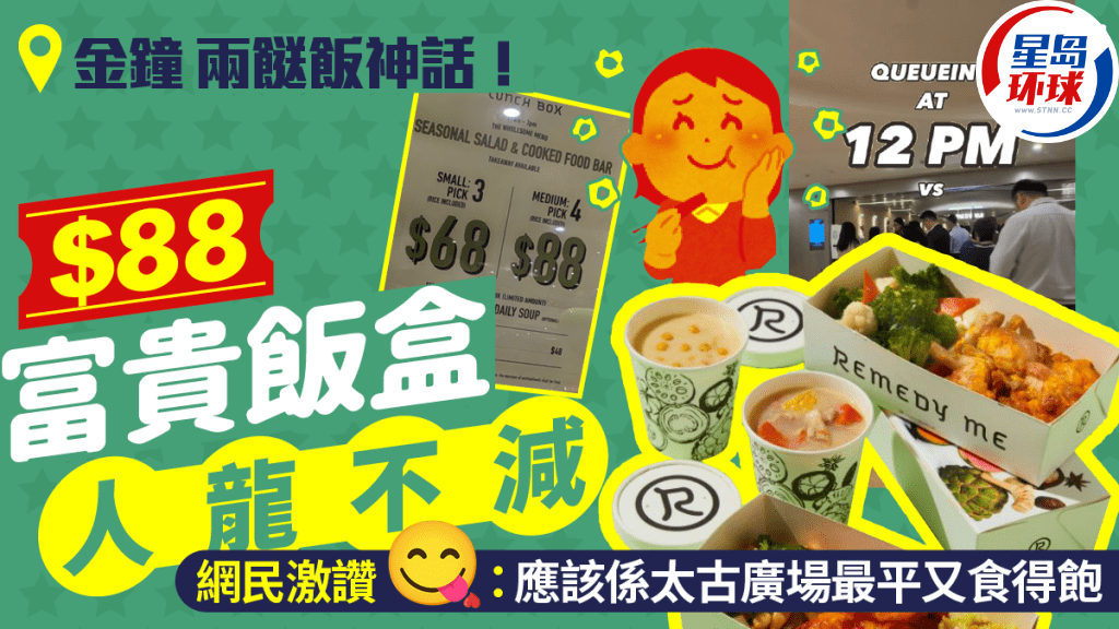 兩餸飯熱潮繼續(xù)成為網(wǎng)民熱話,更由平民美食逐漸“升級(jí)”成為白領(lǐng)恩物,部分更進(jìn)軍至一線商場,惹來網(wǎng)民熱議。近日,有網(wǎng)民在社交平臺(tái)分享位于金鐘太古廣場的兩餸飯店“Remedy Me”,該店提供的$68三餸飯及$88四餸飯,由價(jià)格到餐廳地點(diǎn)俱引發(fā)網(wǎng)民的廣泛討論。