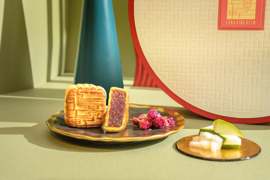 ▲芋頭開心果麻糬月餅,香軟粉糯的麻糬分別配搭芳香的芋頭及酥脆的開心果,煙韌富嚼勁,層次鮮明。($408 港島香格里拉酒店)
