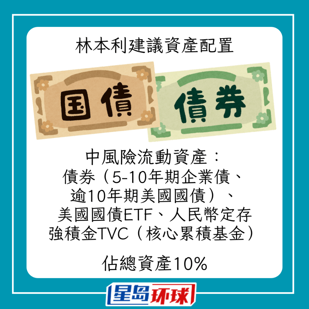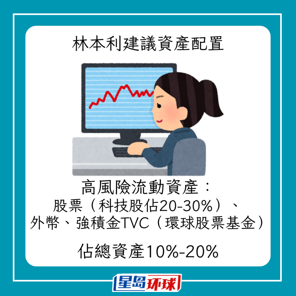 前理大會(huì)計(jì)及金融學(xué)院副教授林本利2011年提早退休,其后創(chuàng)辦理財(cái)教育中心,教授穩(wěn)健投資理財(cái)之道。他向來(lái)教學(xué)生做好資產(chǎn)配置,以分散風(fēng)險(xiǎn)。固定資產(chǎn)如住宅、車位等物業(yè)可占六至七成;其余三至四成為流動(dòng)資產(chǎn)。流動(dòng)資產(chǎn)再按風(fēng)險(xiǎn)劃分,股票、外幣屬高風(fēng)險(xiǎn)資產(chǎn),最多占總資產(chǎn)的兩成;中風(fēng)險(xiǎn)資產(chǎn)占一成,投資在藍(lán)籌公司企業(yè)債,以及長(zhǎng)年期美國(guó)國(guó)債。最后一成的低風(fēng)險(xiǎn)資產(chǎn)則有定存、港府債券、短期儲(chǔ)蓄壽險(xiǎn)。
