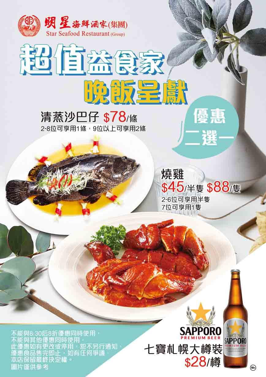 最近明星海鮮酒家再度推出吸引的晚市優(yōu)惠,重點(diǎn)推介有“優(yōu)惠二選一”,包括只需$78/條的清蒸沙巴仔,適合2至8位顧客享用,9位以上剛可享用2條。另一款可選菜式是燒雞,半只$45、全只$88,2至6位可享半只,7位以上可享用一只。