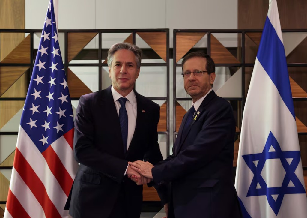 ▲美國國務卿布林肯抵達耶路撒冷,與以色列總統(tǒng)赫爾佐格見面,再次勸告以色列盡力完成人質(zhì)釋放協(xié)議。(圖/路透社)