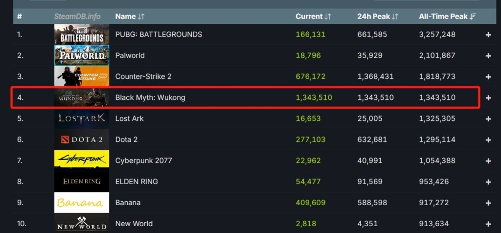 ▲據(jù)SteamDB數(shù)據(jù),上線一小時左右,《黑神話:悟空》同時在線玩家數(shù)已突破100萬。