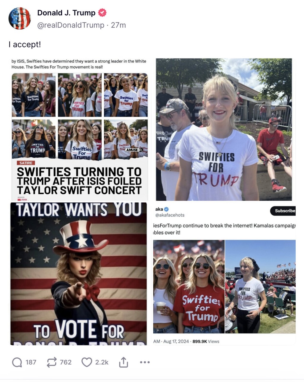 美國(guó)大選 | 特朗普轉(zhuǎn)發(fā)AI生成圖片,稱接受Taylor Swift“支持”