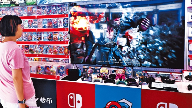▲北京市民正在一間游戲店內(nèi)觀看《黑神話:悟空》的宣傳片。