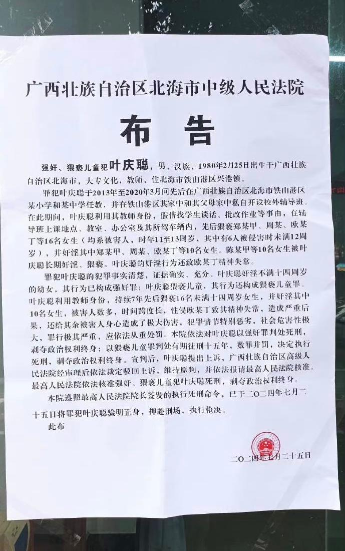 ▲北海市中級(jí)人民法院公告,強(qiáng)奸幼女罪犯葉慶聰已被槍決。