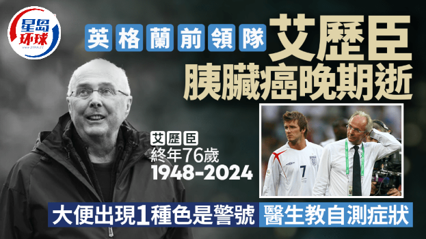 埃里克森/英格蘭領隊/曼城/胰臟癌|前英格蘭國家隊領隊埃里克森(Sven-G?ran Eriksson),周一(26日)因胰臟癌病逝,終年76歲,去世時家人陪伴在側(cè)。胰臟癌部分癥狀與小病小痛相似,容易被忽略,或誤以為是普通消化不良。醫(yī)生指出,若發(fā)現(xiàn)大便呈現(xiàn)一種顏色就要留神,隨時是患上胰臟癌的警號。