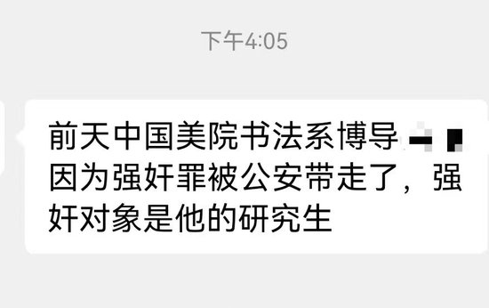 8月26日,浙江網(wǎng)民發(fā)布的多張微信群聊天截圖顯示,8月24日,中國美術(shù)學(xué)院書法系博導(dǎo)趙愛民因涉嫌強(qiáng)奸被公安機(jī)關(guān)帶走,女方是其指導(dǎo)的研究生馬某某(30歲)。