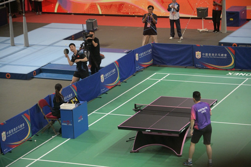 他在表演環(huán)節(jié),非常親民,盡情表演。先與香港第一號男單黃鎮(zhèn)廷對打,又用白板,又不停玩反手,最后跨出圍板,同黃鎮(zhèn)廷幾乎調(diào)轉(zhuǎn)方向?qū)Υ?,真正玩到盡。