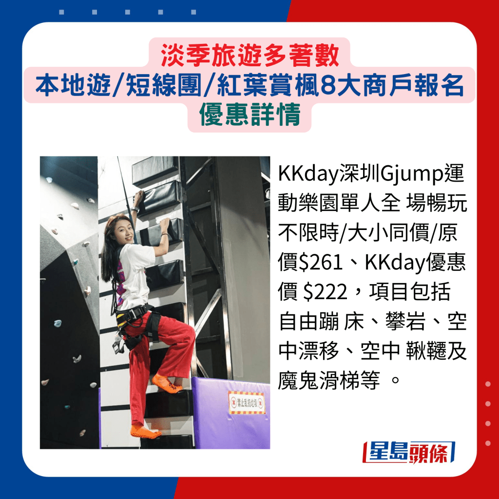 暑假旅游旺季結(jié)束,在淡季期間參加香港游及短線旅行團(tuán),尤其著數(shù)。除了個(gè)別網(wǎng)站提供專享優(yōu)惠價(jià)之外,部分更可獲贈(zèng)行李箱等不同禮品,抵上加抵!另有意欣賞紅葉盛放的話,多間旅 行社現(xiàn)正推出不同的報(bào)團(tuán)優(yōu)惠,趕快選定心水地點(diǎn),相約三五知己同享旅游樂(lè)。