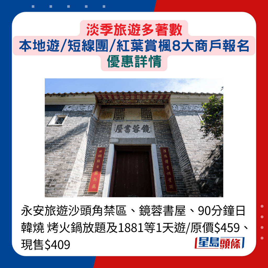 永安旅游沙頭角禁區(qū)、鏡蓉書(shū)屋、90分鐘日韓燒烤火鍋放題及1881等1天游